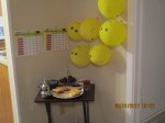 A children’s Ramadan calendar, Daghmoumi children, is pinned to the wall next to the mantle. Another wall serves as a place to hang inflated yellow balloons, each containing a piece of candy. At the end of each day, the children get to pop one of the balloons.