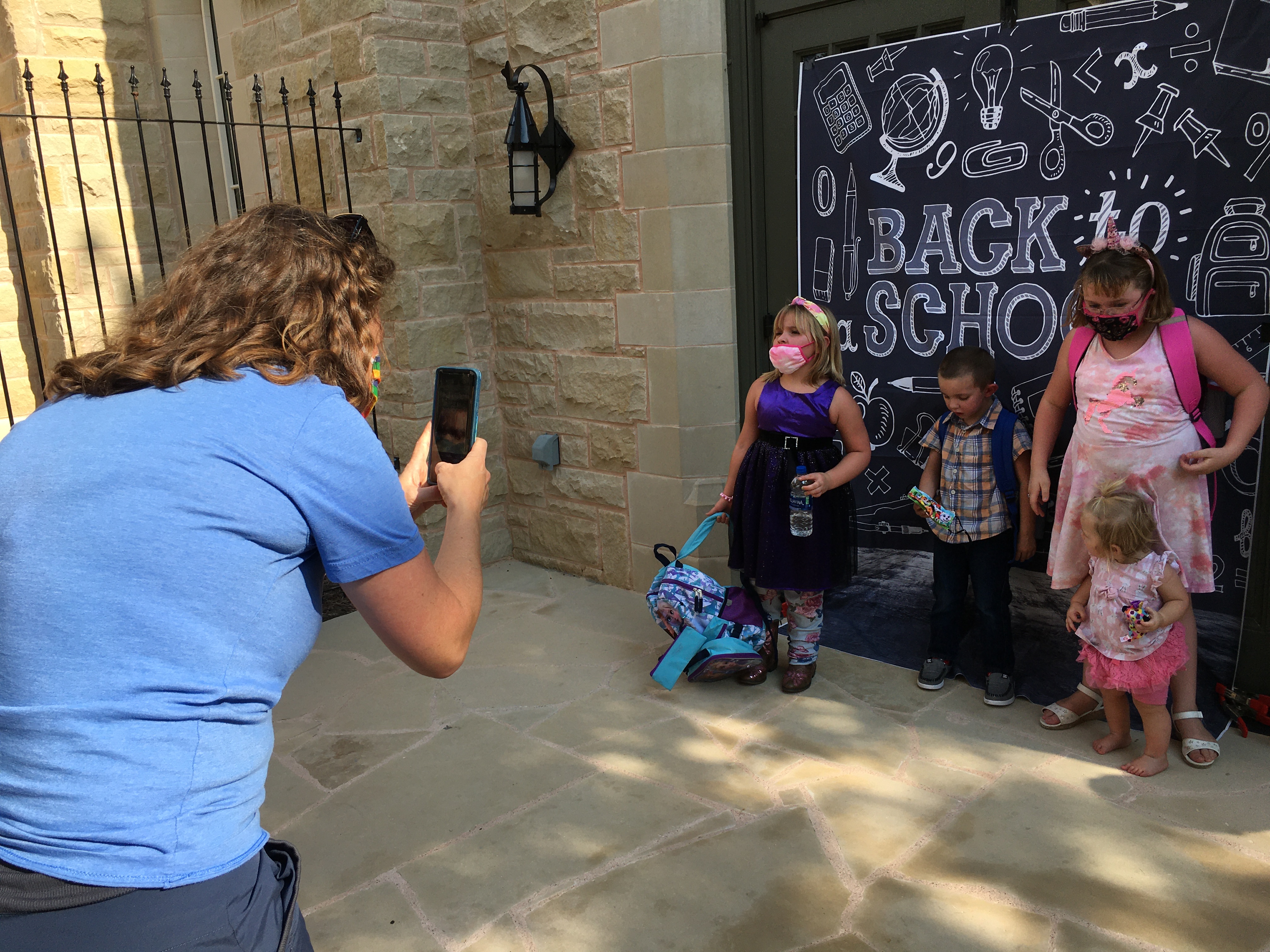 With COVID-19 on everyone’s mind, social distancing was maintained and adults wore masks. Children entering the courtyard got their photo taken in front of a backdrop that resembled an old-fashioned blackboard with chalk writing.