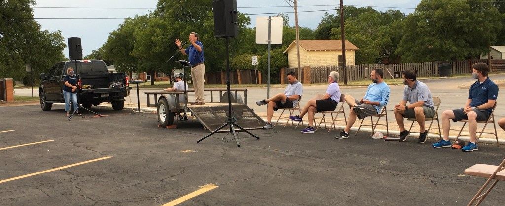 Across town a couple of hours later, Pioneer Drive Baptist Church staged an outdoor prayer service for teachers, students, administrators, and support staff. A speaker’s stand was set up on a trailer with a sound system attached. Guests stayed in their vehichles in the church’s west parking lot and listened to the service on the radio.