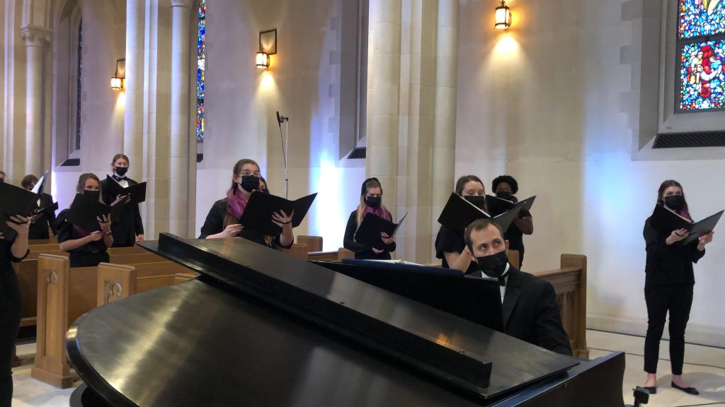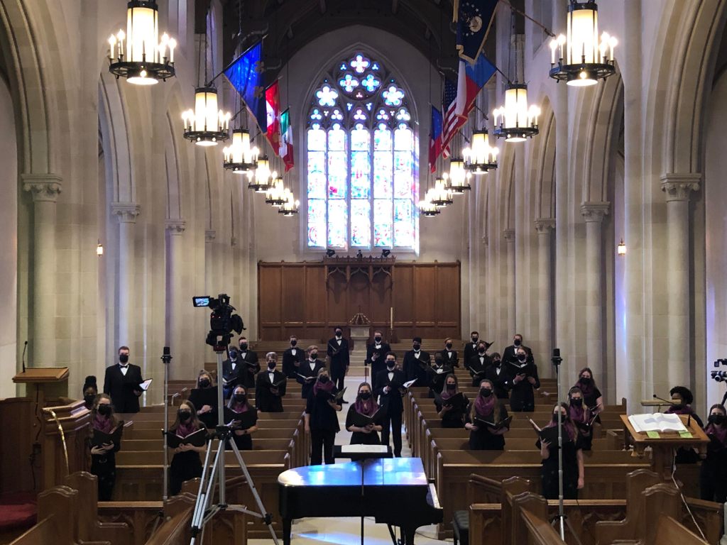 Singing through a mask was just one of the challenges that Goolsby and his students faced. Each group, according to size, filmed its part of the program at one of three locations–First Baptist Church, ACU’s Cullen Auditorium, and the Episcopal Church of the Heavenly Rest. Choirs performed at Heavenly Rest and First Baptist. Instrumental groups performed at Heavenly Rest and Cullen Auditorium. Jesse Ratcliff, director of music and organist at Heavenly Rest, accompanied the choirs.