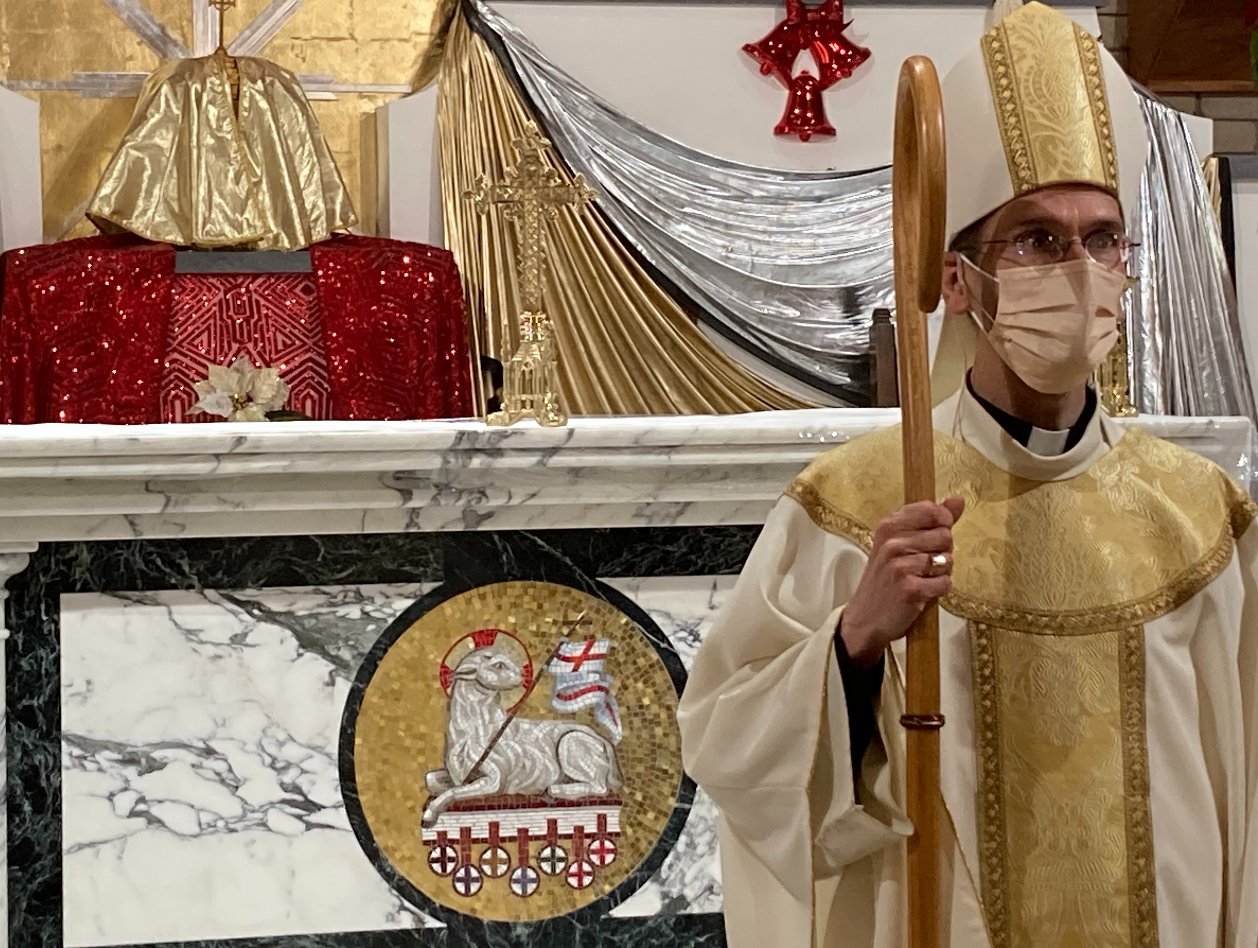 Left to right in the top left photo, Father Emilio Sosa, Bishop Michael Sis, and Deacon Victor Ramirez celebrate Mass of dedication for a new altar at St. Vincent Pallotti Catholic Church Dec. 26. The photo at top right is the mosaic lamb. At bottom right, Bishop Sis prepares for the recessional. Photos by Loretta Fulton