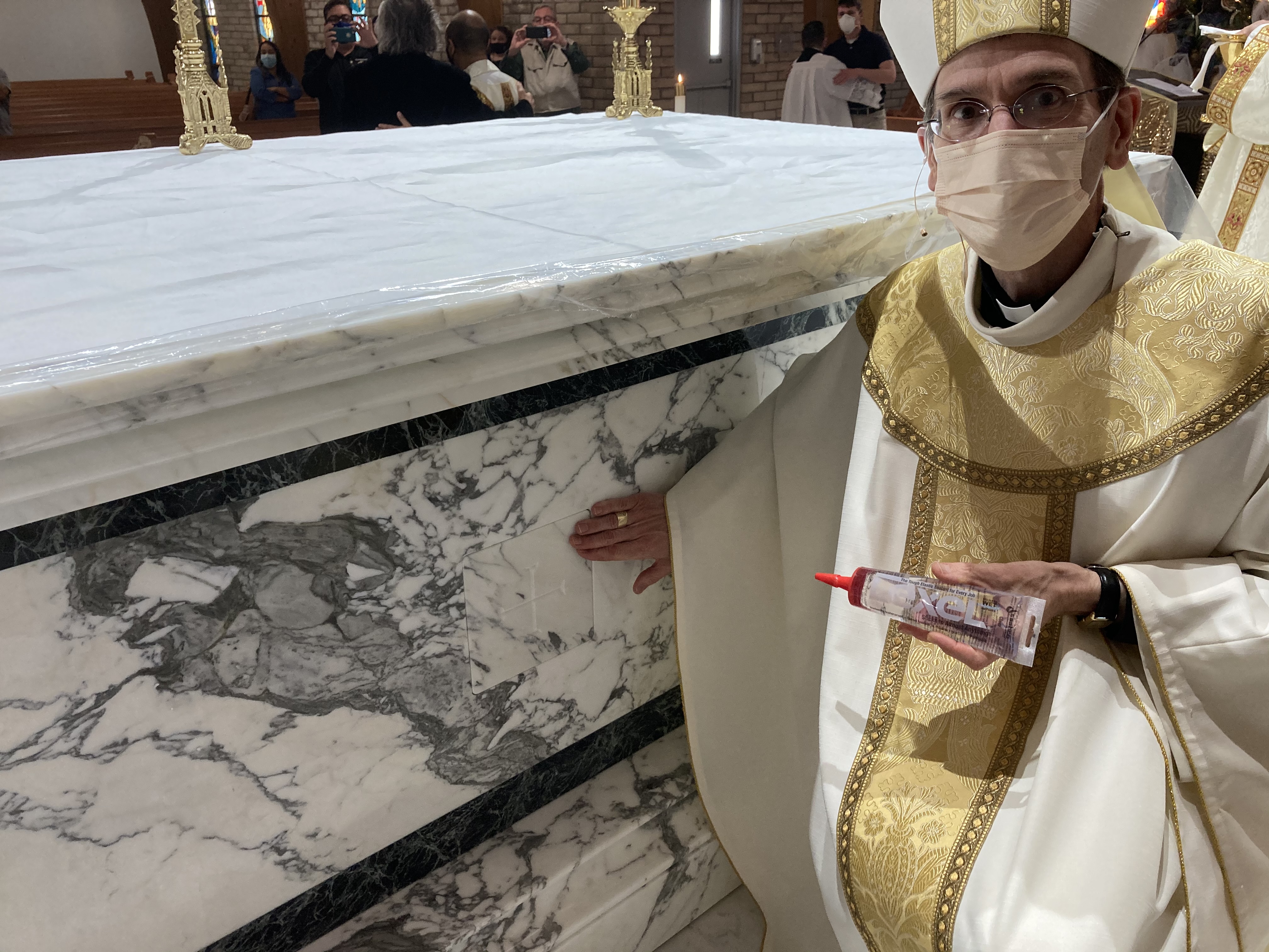 Following the dedication and anointing of the altar, Sis presided over the Mass, with masked parishioners processing to the altar for the Eucharist. The altar had been in place for a week but couldn’t be used for Mass until the dedication, Sis explained.
