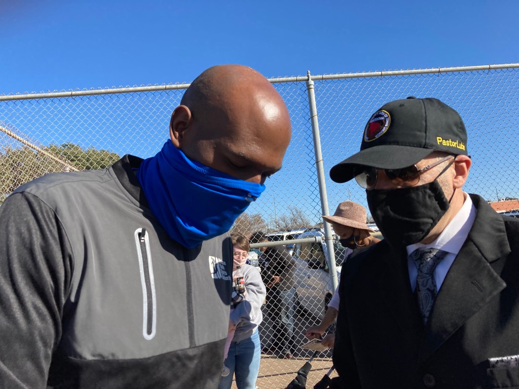 New Abilene Police Chief Marcus Dudley, right. greets a participant at the MLK Day gathering Jan. 18. Photo by Loretta Fulton