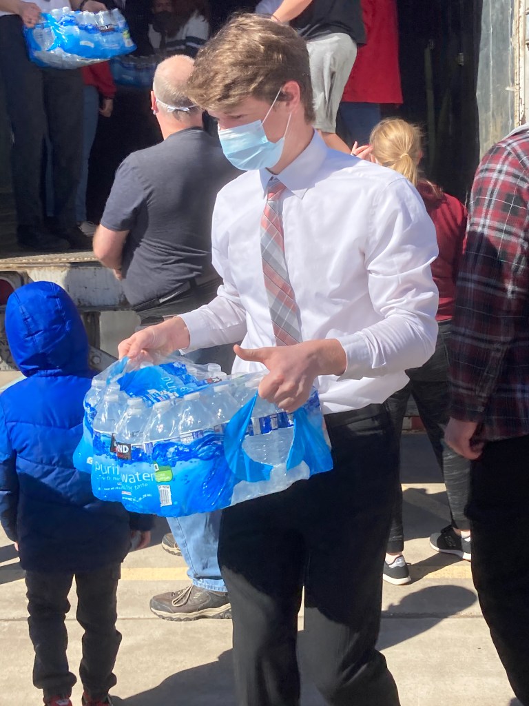 On Sunday, February 21, members of The Church of Jesus Christ of Latter-day Saints were busy unloading pallets of bottled water in the parking lot to help the Abilene community. Abilene was under a boil water notice, and parts of the city and surrounding area are still without water because of broken water lines. The semi-truck then delivered the second half of the bottled water to San Angelo, where local volunteers and missionaries there worked to unload the truck and disburse the water to people in need. Each area received 10 pallets of water each.