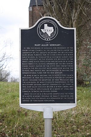 Hundreds of African American women in East Texas received educational opportunities thanks to the Board of Missions for Freedmen of the Presbyterian Church, which established Mary Allen Seminary in Crockett, Texas, in 1886. Board secretary Richard Allen of Pittsburgh, Pennsylvania, and his wife, Mary Esther Allen, led efforts to provide support for the school, and when Mary Allen died suddenly just before it opened, it was named in her honor.