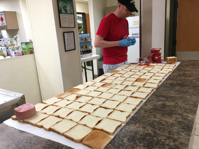 Joe Biles, left, and Biles and Lee Hampton, prepare sandwiches and food bags at B.O.B.S. during the time of COVID. Photos by Loretta Fulton