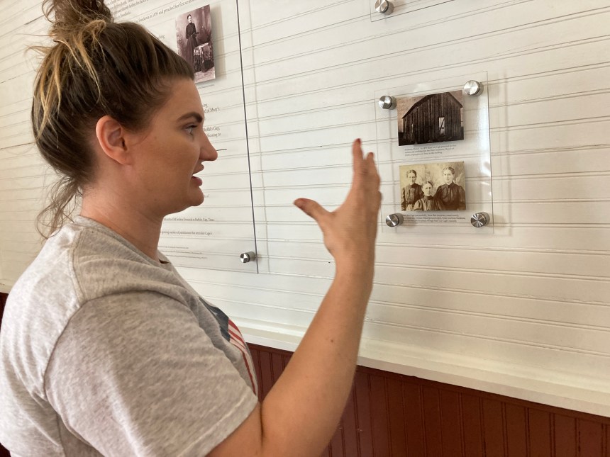 An informational plaque in the exhibit outlines the chapel’s history, along with Cagle’s. The chapel was built under the New Testament Church of Christ denomination. The plaque notes that Cagle “was an influential member of a group of female preachers who began traveling and organizing evangelical meetings throughout the South in the 1890s. She oversaw a growing network of congregations and became a co-founder of the Nazarene faith after the Holiness New Testament Church of Christ merged with the Pentecostal Church of the Nazarene during a conference in Pilot Point, Texas, in 1908.”