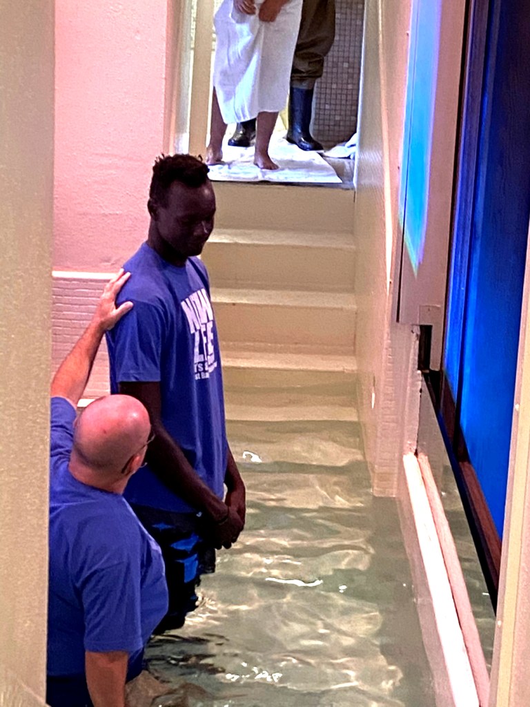 The rehearsal went well. The chair was out of sight in the baptismal pool. Deng was seated, and Brown leaned Deng’s upper body “forward and under” so he would be fully immersed. There was, however, a slip “twixt cup and lip.”
