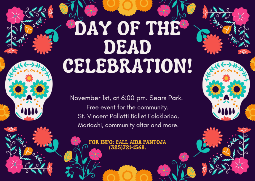 A couple of opportunities to experience the rich tradition of Dia de los Muertos are coming Nov. 1 and 2. On Monday, Nov. 1, Aida Pantoja will stage a Day of the Dead Celebration beginning at 6 p.m. at Sears Park. It is a free community event, featuring the St. Vincent Pallotti  Catholic Church’s Ballet Folklorico, a mariachi band, community altar, and more. Several businesses will have tables set up and will hand out goodies to everyone.