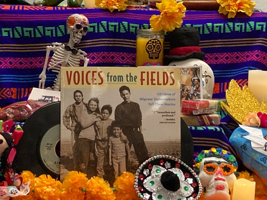 The ofrenda that was featured Oct. 23 had the traditional candles, flowers, and skulls, plus items that told something about the man being honored. Among those was an old album jacket with the title, “Voices from the Dead.” The ofrenda also held a nicho box, which is similar to a shadow box filled with mementoes of the deceased.