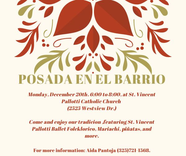 Instead of going house to house, Mary and Joseph will go room to room inside the Pan American Hall at the church, 2525 Westview Drive. The public is invited to participate in the community Las Posadas. Festivities will be held from 6 to 8 p.m., including music, pinatas, a mariachi band, a performance by the Ballet Folklorico, and vendor booths set up by various businesses and organizations.