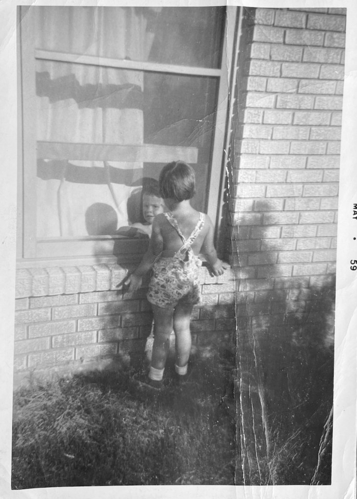 I had a steady path to Mary Beth’s house. I liked to meet her at her parent’s bedroom window, facing our house, to plan our day. You can see us chatting in the black and white photo taken by my mother, a great observer.