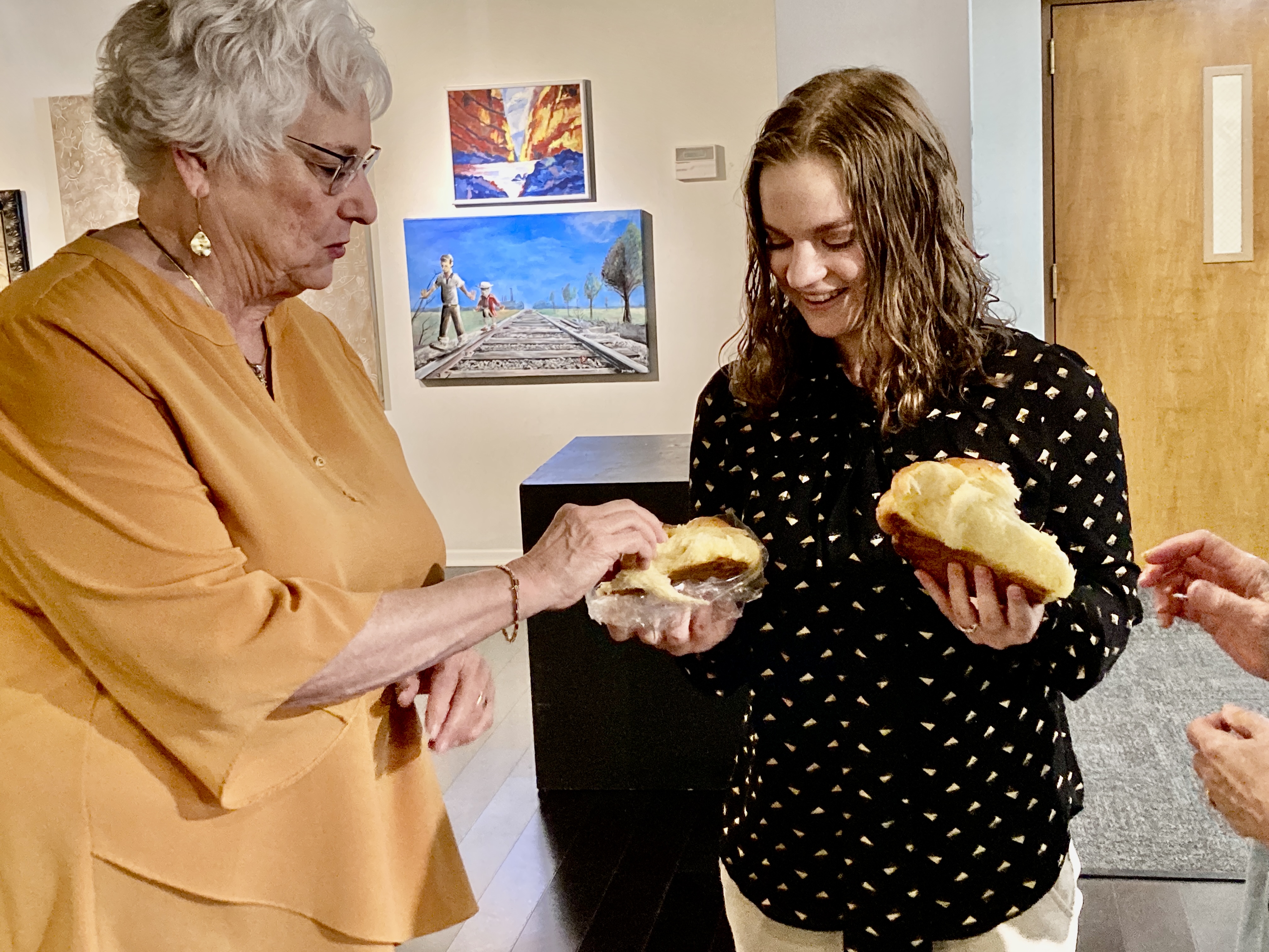 In the photo on the left, Grace Sosa, right, breaks bread with Judith Phaneuf. In the right photo, Omer Hancock shares challah bread at the Abilene Interfaith Council’s National Day of Prayer service. Photos by Loretta Fulton