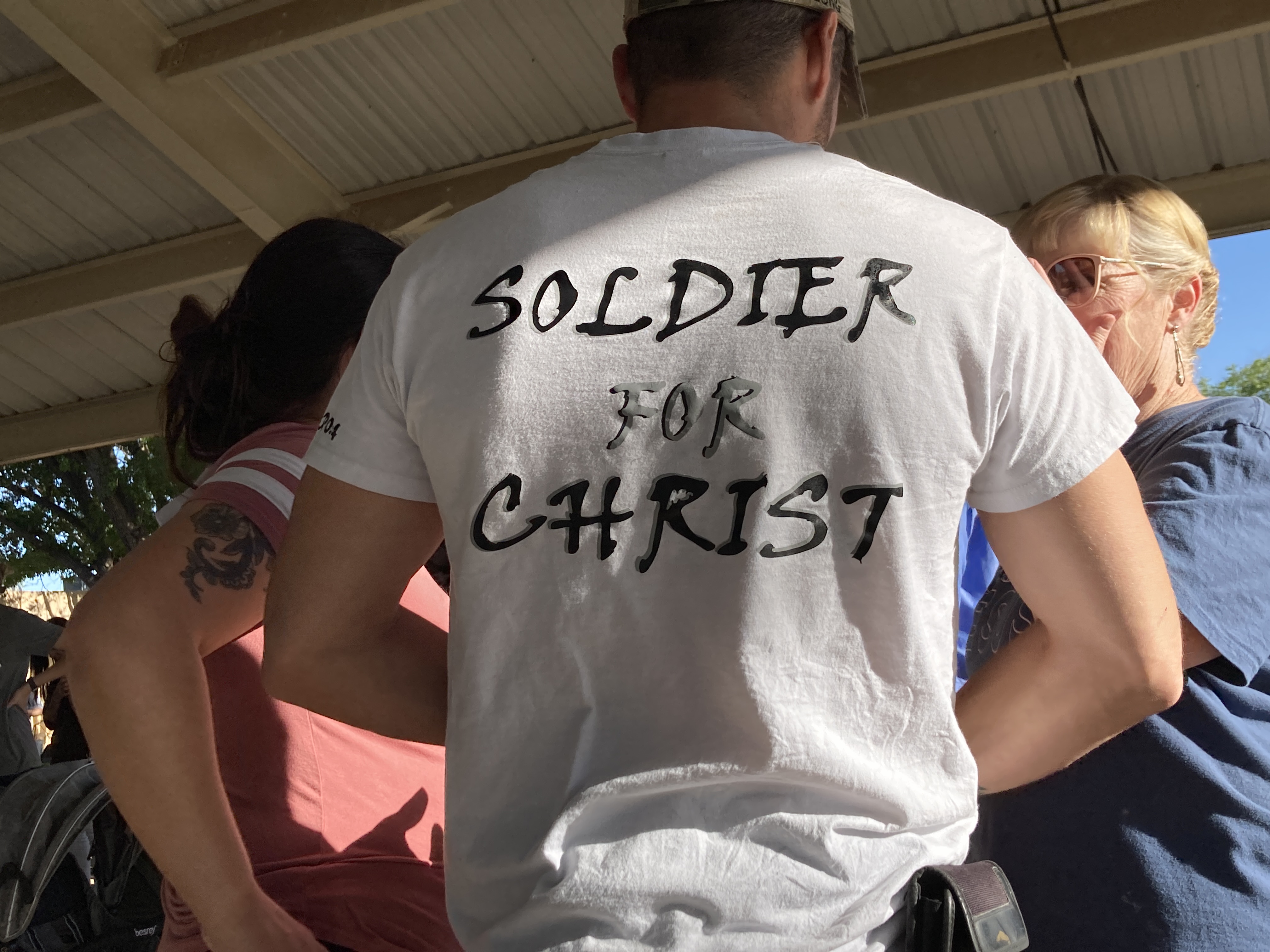 At the Abilene Interfaith Council service, 12 people offered prayers from various faith traditions and several Christian traditions. The 1-Kingdom services were strictly Christian, with T-shirt slogans like “Jesus is Bigger Than Sunday” and “Soldier for Christ” in abundance.