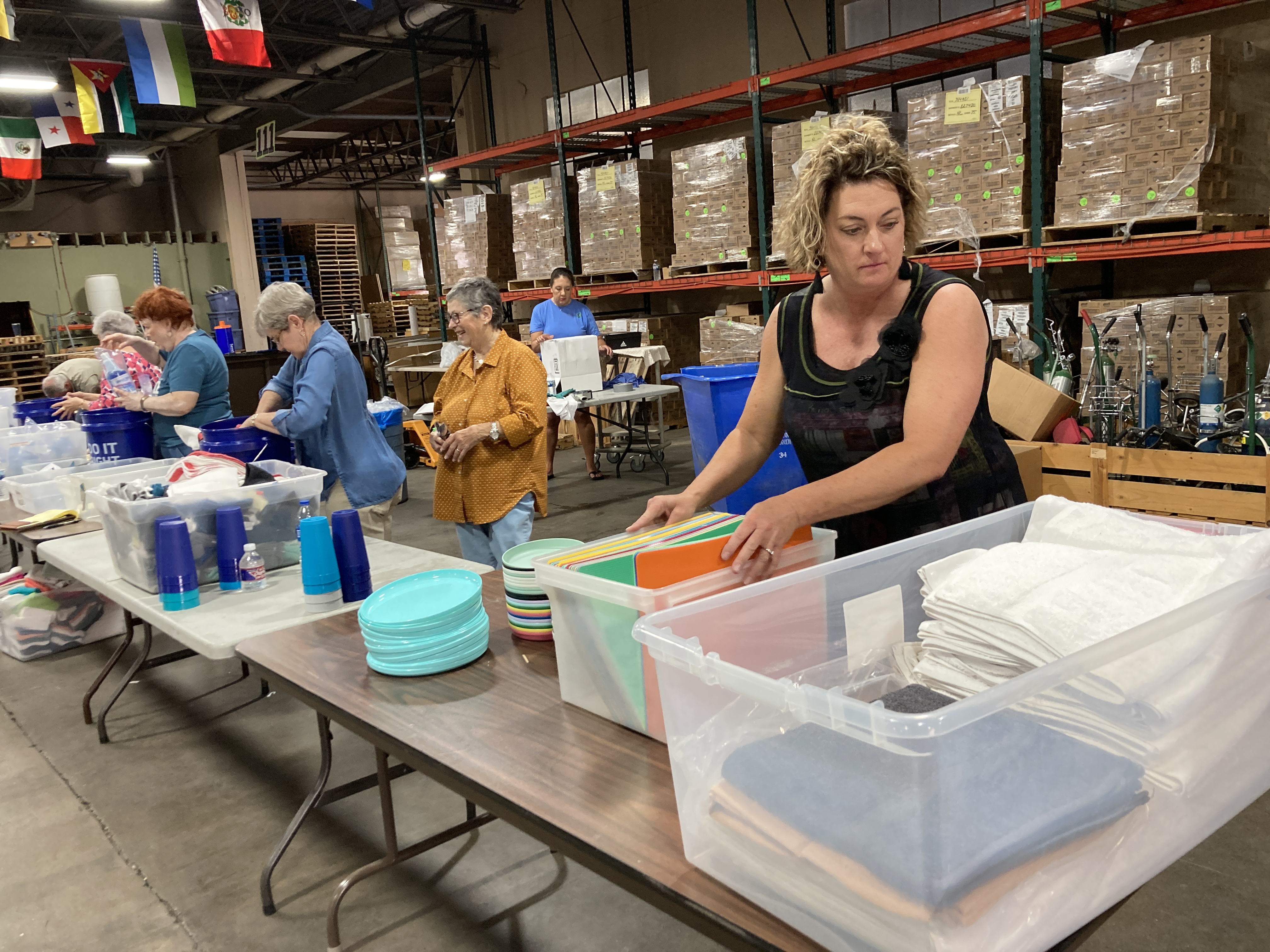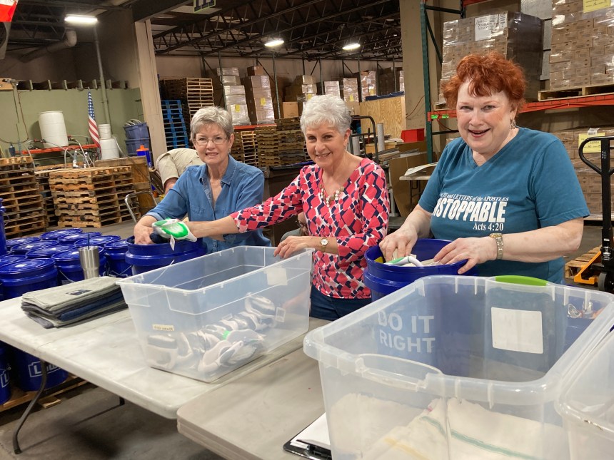 Heather Juarez, director of marketing and communications for Global Samaritan Resources, packs a bucket that will be shipped to Romania for distribution to Ukrainian refugees. Photo by Loretta Fulton