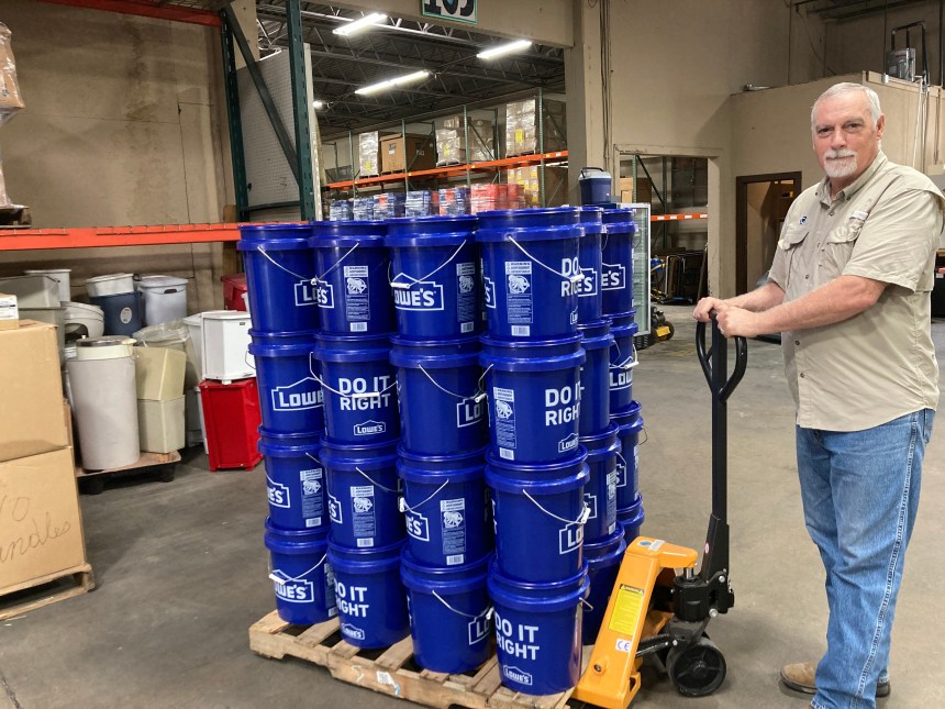 Mike Murphy moves a stack of filled buckets to a staging area at Global Samaritan Resources. Photo by Loretta Fulton