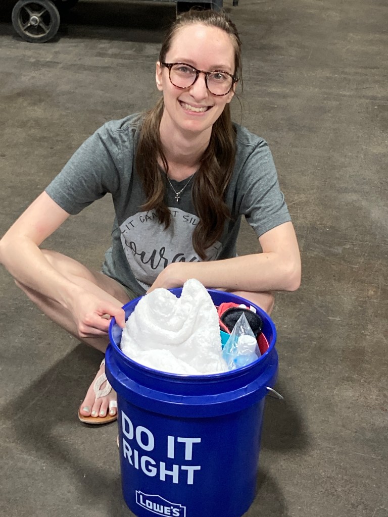When the volunteers showed up Monday, everything was in place to begin the assembly line process of packing the buckets, guided by a printed “Bucket List.” Other volunteers had set everything out the previous Friday, so that Monday’s volunteers could get started as soon as they arrived–or almost as soon as they arrived.