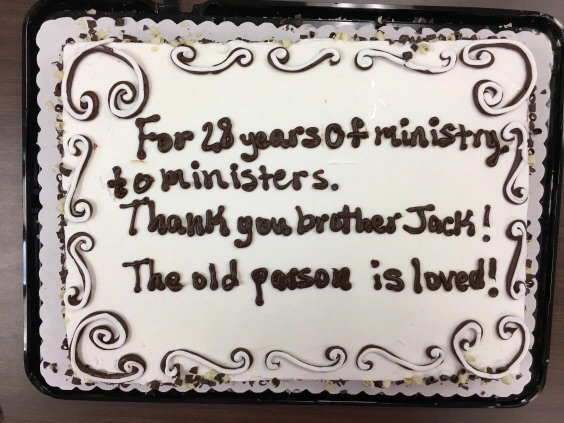 Cake presented to Jack Ridlehoover on May 6, 2019, his last day to offer mentoring sessionst at Abilene-Callahan Baptist Association office. (Photo by Loretta Fulton)