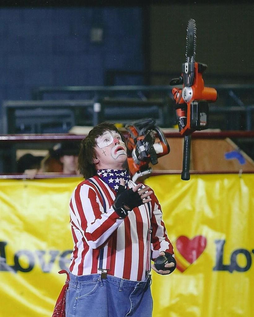 Dr. Collins’ propensity to feel “at home” with potential chainsaw dangers would be more understandable if he had confined this act to the years of his youth. He hasn’t, though, developing the chainsaw routine a decade ago when he retired from the superintendency. His last public performance was in 2019 on his 65th birthday in Oklahoma City, and last year he performed at the Rodeo Clown Reunion of the Pro Rodeo Hall of Fame in Colorado Springs, Colorado.