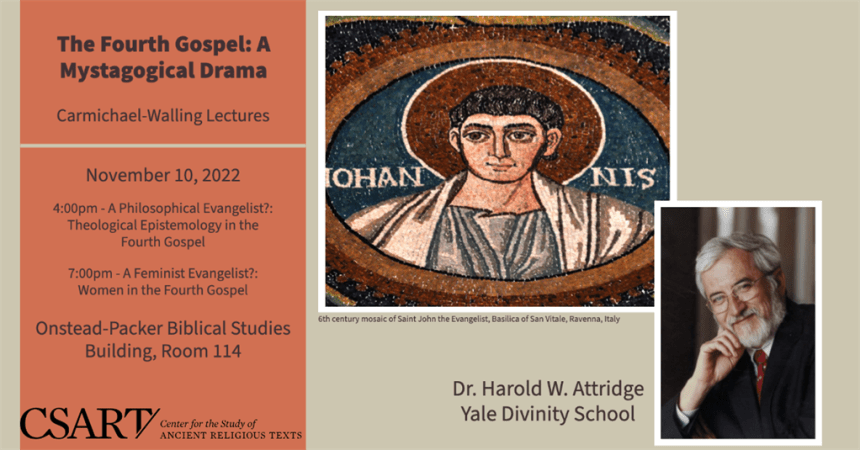 Dr. Harold W. Attridge of Yale Divinity School will give the 2022 Lectures on the theme, “The Fourth Gospel: A Mystagogical Drama.” The first lecture, “A Philosophical Evangelist? Theological Epistemology in the Fourth Gospel,” begins at 4 p.m. Thursday. The Fourth Gospel can perhaps be best described as a “mystagogical drama,” inviting readers to encounter the Word of God enshrined in human words and in the process to deepen their faith in that Word. As part of that process the gospel engages in a set of questions that intrigued contemporary thinkers. These questions involve exploration of how sense perception and human words work to make God known. The evangelist, aware of philosophical discussion, provides a challenging response focused on the Word incarnate.