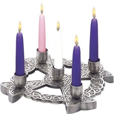 Most of these wreaths consist of four candles in a circle with a fifth candle in the center and surrounded by an evergreen bough. Although the colors are not prescribed, most people use three purple and one pink candle for the four Sundays before Christmas. The center candle, called the Advent candle, is white.
