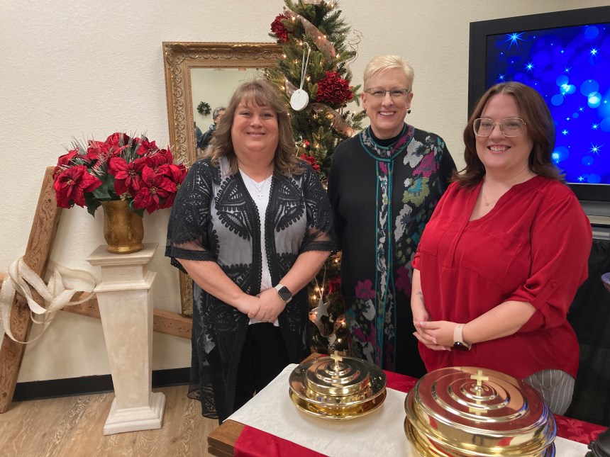 Chesna Riley, right, prepares for her ordination on Dec. 18 at Brook Hollow Christian Church. Representing the Southwest Region of the Disciples of Christ was Heather Reed, left. Dr. Lisa Davison, center, was guest preacher. She teaches Hebrew Bible at Phillips Theological Seminary, where Riley earned a master of divinity degree. Photo by Loretta Fulton