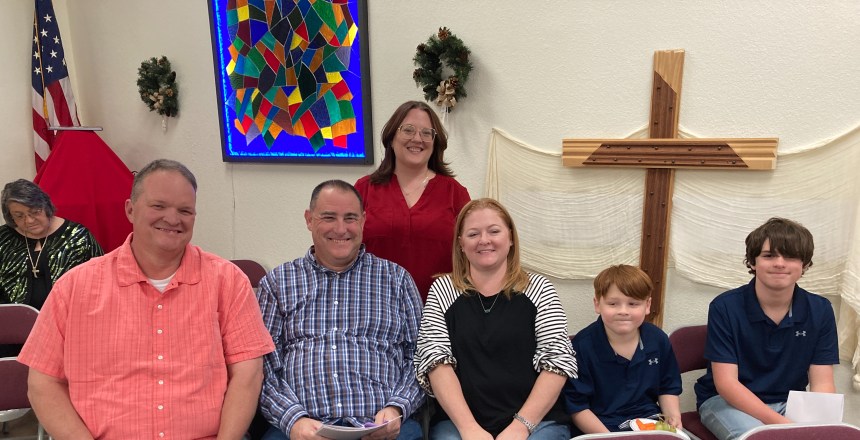Family members were among the guests for the ordination of Chesna Riley, standing in back. Seated left to right are her brother, Chris Riley, brother-in-law Trey Rose, sister Charity Rose, Bear Rose, and T.J. Rose. Photo by Loretta Fulton