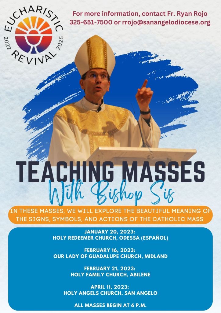 The Teaching Mass will begin at 6 p.m. Tuesday, Feb. 21, at Holy Family, 5410 Buffalo Gap Road. The bishop will explore “the beautiful meaning of the sign, symbols, and actions of the Catholic Mass.” The Teaching Mass at Holy Family is one of four that the bishop is leading across the Diocese of San Angelo.