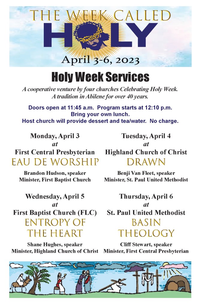 The Holy Week Luncheon Series is a cooperative venture by First Baptist, Highland Church of Christ, St. Paul United Methodist, and First Central Presbyterian churches.