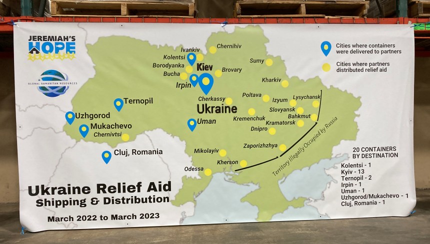 Map shows where Global Samaritan Resources has shipped food and goods to assist Ukrainians. Photo by Loretta Fulton