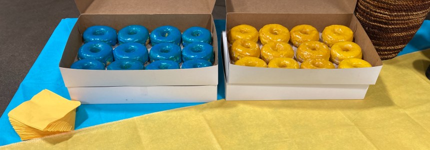 The familiar blue and yellow colors of the Ukrainian flag were everywhere Thursday–even in the icing on the doughnuts–as Global Samaritan Resources celebrated loading its 20th shipment to the embattled nation.