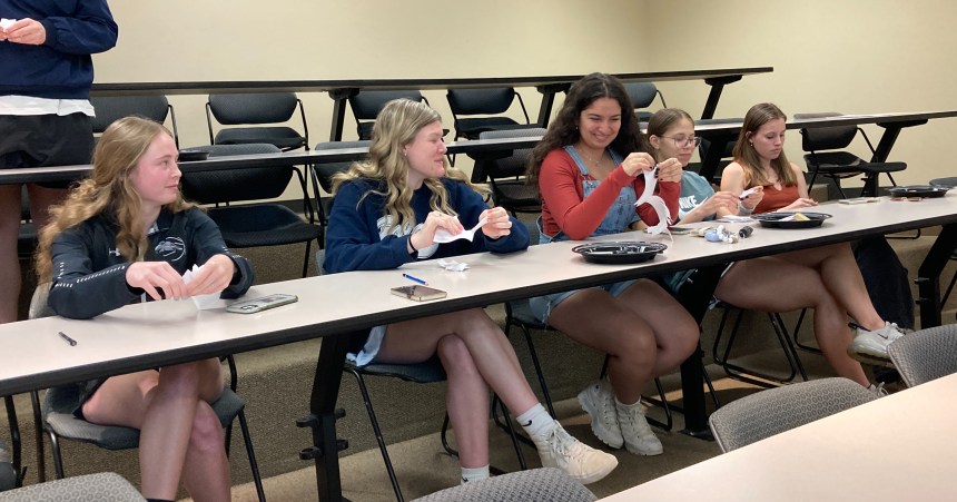 The introduction consists of stating your name, major, and classification. The icebreaker for the evening was stating a personal theme music. On a recent Tuesday, Charles also had the students write down what was burdening them such as grudges, negative emotions, etc., as calming music played in the background.