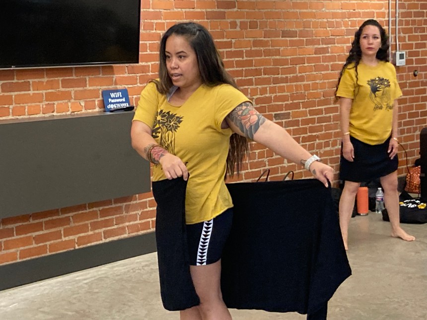 As the guests lined up to learn the basic moves, Suliven handed out colorful folded fabrics that formed a “pareo” or sarong. Suliven instructed the group to make a knot on their left side, signifying their student status.