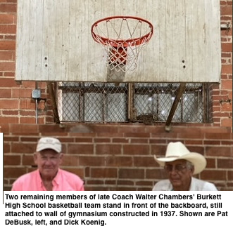 When the school opened, Burkett’s “sports facility” was an outdoor dirt basketball court. Interest grew, and soon all boys in high school–with one or two exceptions—went out for basketball every year. Chambers also coached girls’ teams when they had enough players. Soon Coach Chambers and his teams were the talk of the community.