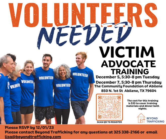 Training for people interested in becoming a survivor advocate will be held at Beyond Trafficking Dec. 5 and 7.