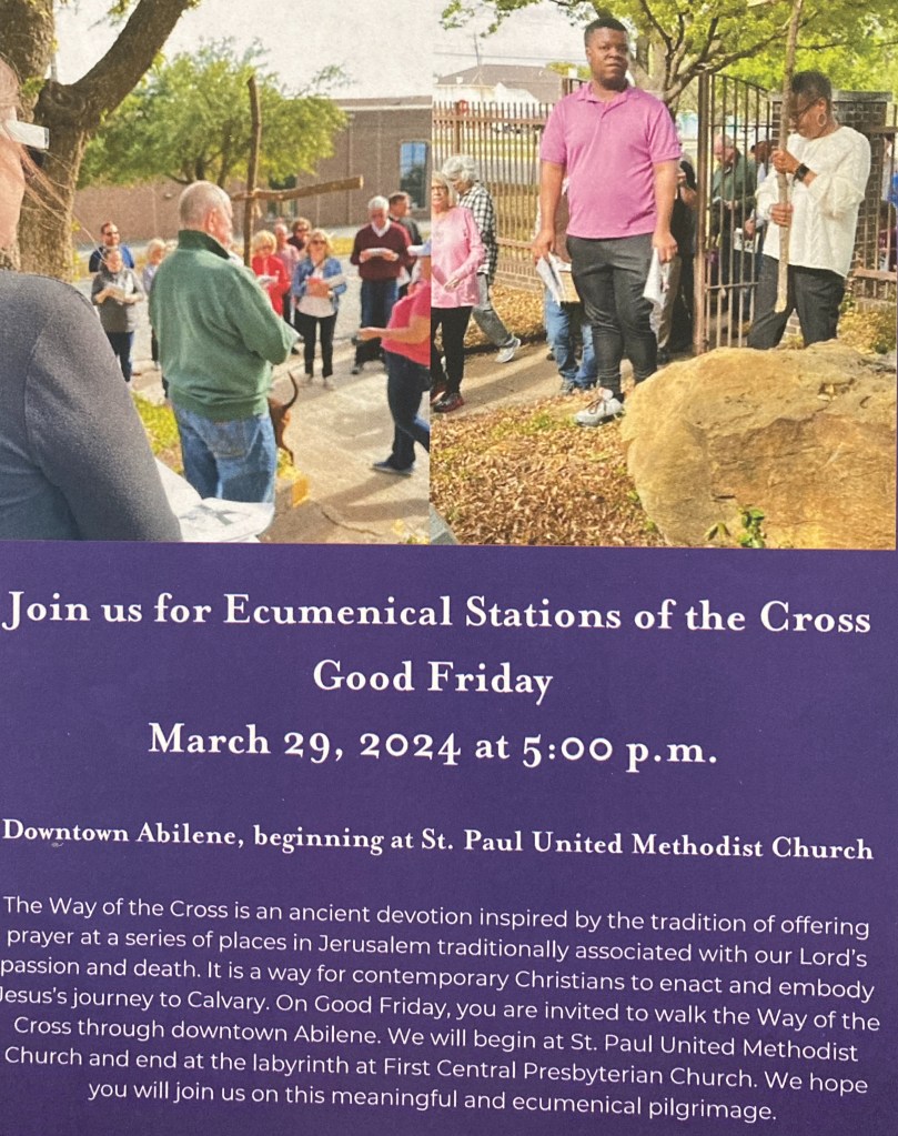 The community is invited to participate in an ecumenical Stations of the Cross procession that will begin at 5 p.m. on Good Friday, March 29.