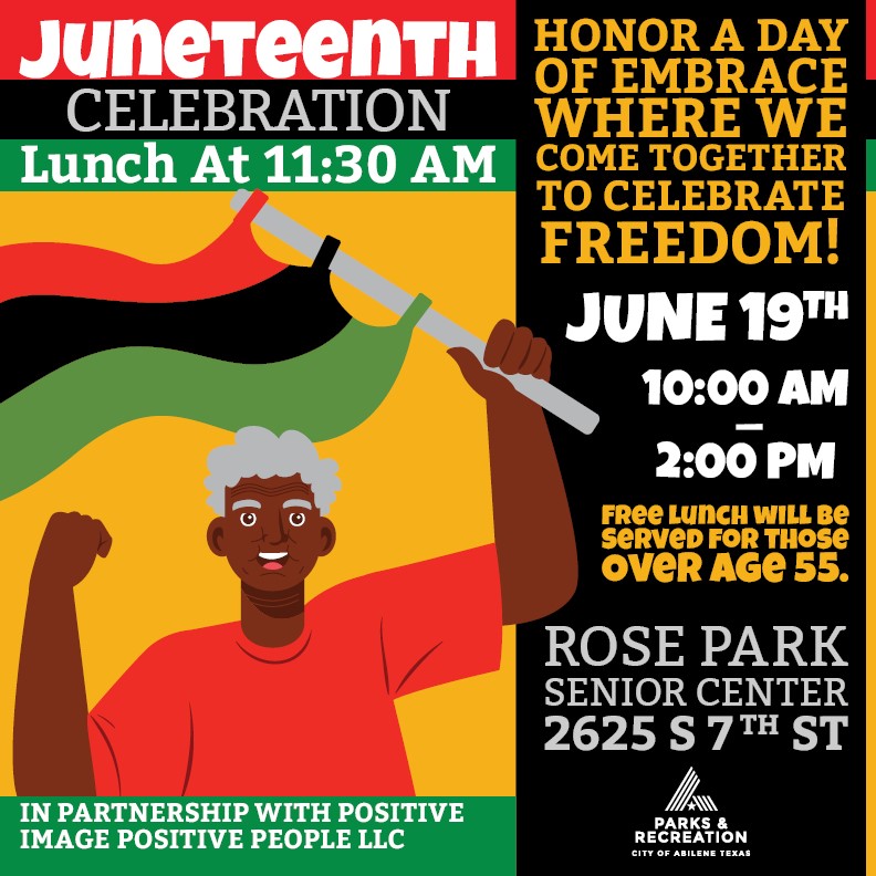 On June 19, the celebration at Rose Park Senior Center, 2625 S. Seventh St., will be 10 a.m.-2 p.m. Lunch will be served at 11:30 a.m. The event is in partnership with Positive Image Positive People of Abilene.