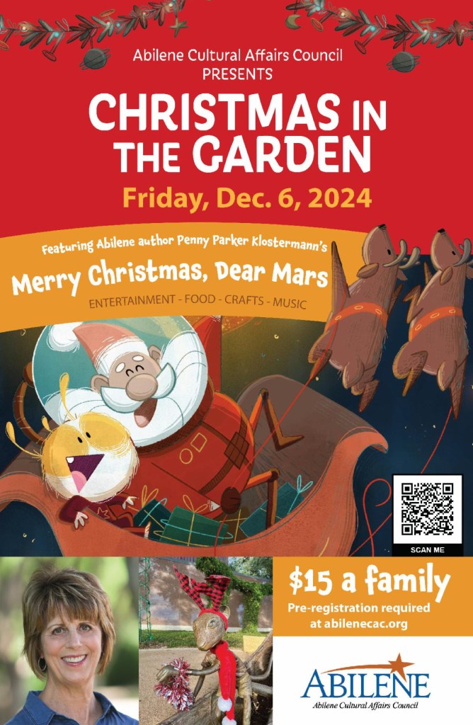 Events will be in the Adamson-Spalding Storybook Garden in front of the Convention Center downtown. Meet Santa Claus and his Martian friends, with Abilene author Penny Parker Klostermann. She will debut her new hit book “Merry Christmas, Dear Mars” with space-themed games, food, crafts and costume characters. Penny will read her book on the garden stage.
