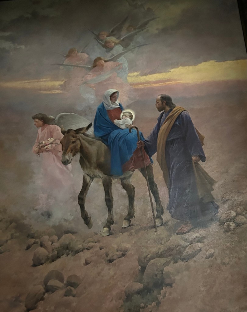 Another image that captured my mind and heart this year is the accompanying photograph of a painting of the flight into Egypt. It’s part of the art collection at Abbey at Montserrat. Many artists, including Henry Ossawa Tanner and Giotto di Bondone, have created moving tributes to the travail of the Holy Family on their way to Egypt, as depicted in Matthew 2:13-23. The text tells us that an angel appeared to Joseph in a dream, warning them that the king sought to murder the Christ child. So, they fled.