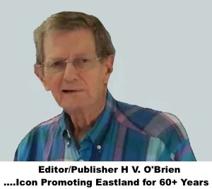 Houston V. O’Brien, beloved editor/publisher of area newspapers for more than 60 years, is “H. V.” to many, maybe because he’s not a “Houston” kind of guy. I usually call him “High Voltage” or “High Volume.” Anyway, he was pre-school age when Ol’ Rip was first encased. Honored by the Texas Press Association and many other groups, he’s spent his life beating the drums for “America’s best hometown” and perpetuating the story of Ol’ Rip. At age 93, he’s still drum-beating in his weekly newspaper, Eastland County Today . His zeal–coupled with substantiated claims of ongoing community progress by the Eastland Chamber of Commerce–make their assertions hard to argue!