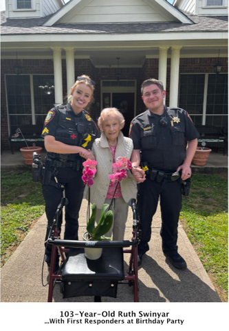 One vignette is provided by a sprightly lady named Ruth Swinyar. At age 103, she is a super star at Fleurdley’s Assisted Living, where her son Dan, daughter-in-law Rose and grandson D. J. are in charge. It’s in a serene rural setting a half-dozen miles off Interstate 35-W, on the southern edge of Fort Worth. She enjoys the outdoors, taking walks, smelling flowers and hearing the bleats of goats as gentle breezes ruffle the trees. A happy conversationalist, she’ll take on just about any topic, but wisely “stops on a dime” when she senses threats from the jungle of technology that can engulf without warning.