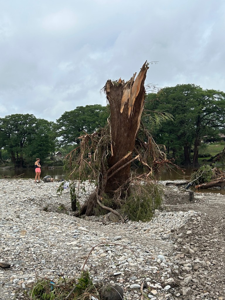 Into the late night of the Fourth, the red-and-blue lights of emergency vehicles flashed in the distance across the river from us. And incongruously, some naïve souls, I suppose young people unaware of the unfolding tragedy, celebrated Independence Day. I listened to the pop pop pop of firecrackers and watched bursts of fireworks on the outskirts of Ingram and Kerrville, but there was no joy in the displays.
