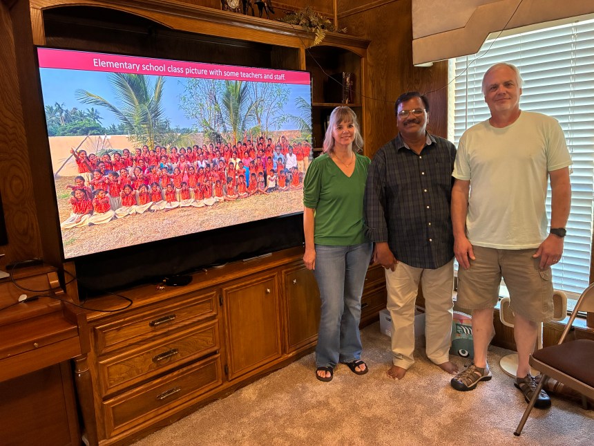 Isaac Palaparthi, center, visits in the home of Cheryl and Matt Merritt. On the screen is a photo of children at International Sanctuary Ministries in India, which Isaac serves as director of operations.