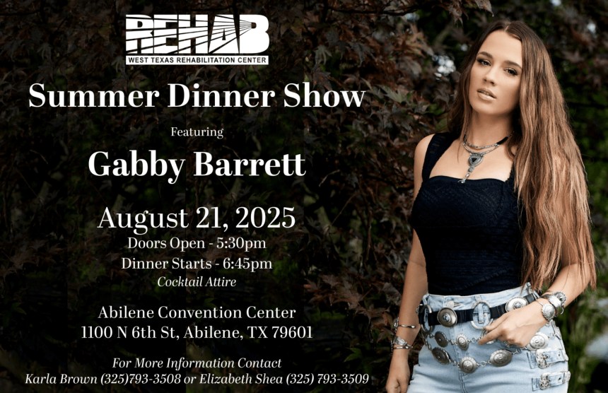 The dinner show will be held 5:30-9 p.m. Aug. 21 at the Abilene Convention Center. Country singer and actress Gabby Barrett will highlight the dinner.