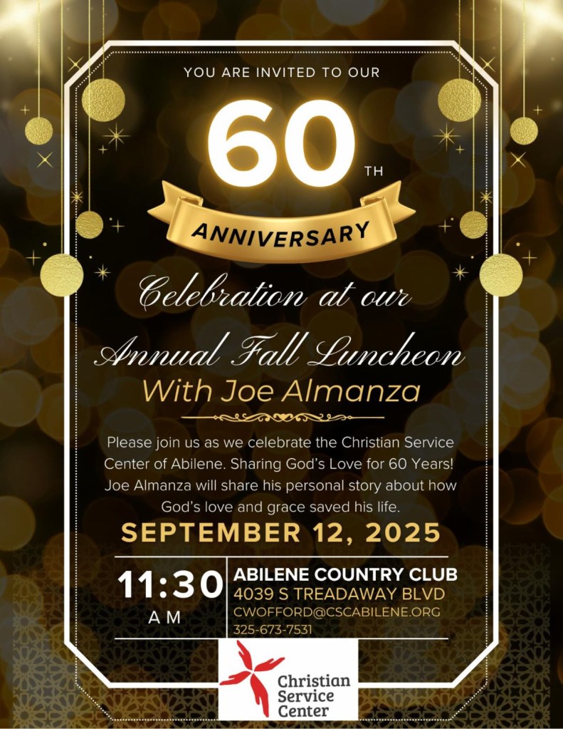 Almanza will give that same testimonial as guest speaker for the 60th anniversary luncheon for Christian Service Center. The luncheon begins at 11:30 a.m. Sept. 12, at the Abilene Country Club, 4039 S. Treadaway Blvd. The buffet line opens at 11 a.m. People who have helped the Christian Service Center over the past 60 years will be honored. Deadline to purchase a ticket is Wednesday, Sept. 10. Deadline to have a name listed as a table sponsor is Monday, Sept. 8. Click here for tickets.