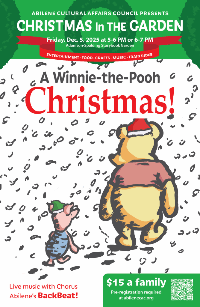 The Abilene Cultural Affairs Council presents its annual Christmas in the Garden on Friday, Dec 5, in Storybook Garden next to the Abilene Convention Center. Sessions will be held 5-6 p.m. or 6-7 p.m.Theme is “A Winnie-the-Pooh Christmas!” The evening will be filled with food, arts, crafts, and Mrs. Claus a book on the garden stage. Chorus Abilene’s BackBeat a cappella pop group will perform. Cost is $15 per family and reservations are required. Click here for tickets.