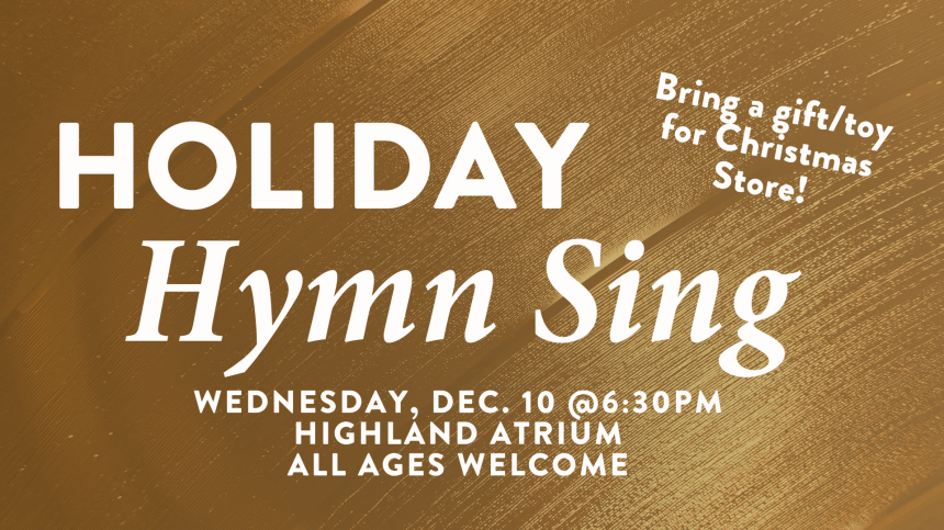 Everyone is invited to a night of worship and Holiday Hymn Singing at 6:30 p.m. Wednesday, Dec. 10, in the atrium at Highland Church of Christ, 425 Highland Ave.