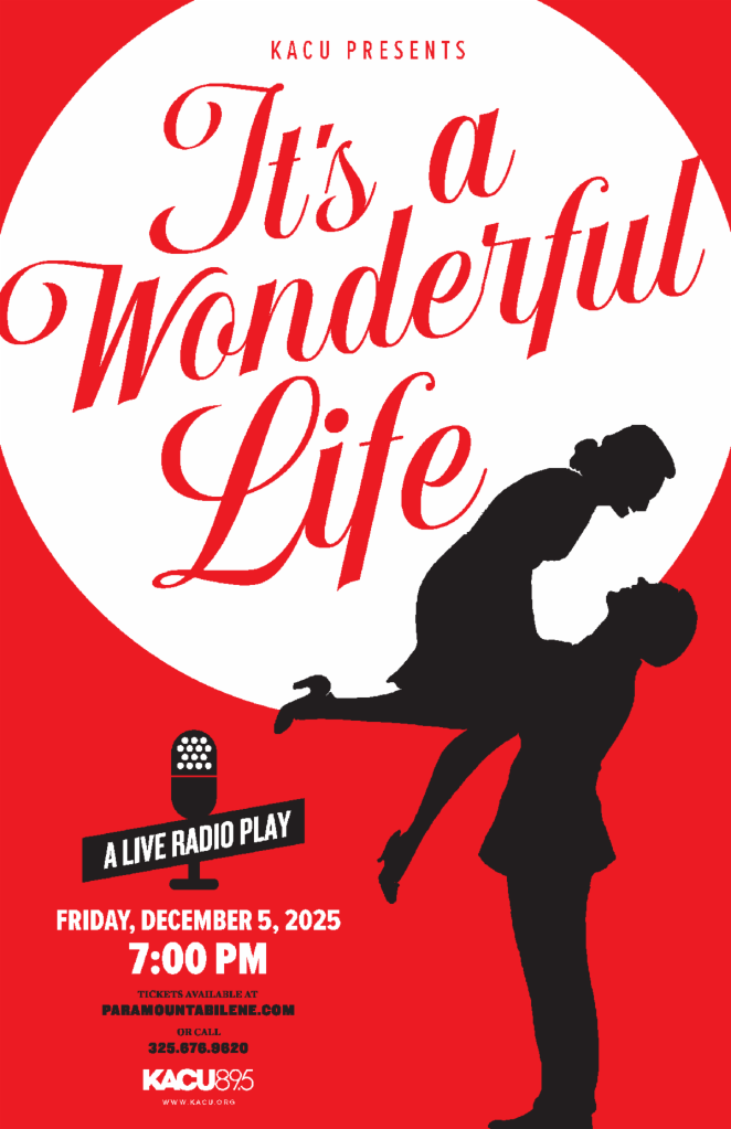 KACU, Abilene’s NPR station, will present a live radio performance of “It’s a Wonderful Life” at 7 p.m. Friday, Dec. 5, at the Paramount Theatre. Doors open at 6 p.m. Tickets are $12 for General Admission. Students/Senior/Military tickets are $10. Children 12 and under will be admitted for free. Click here for tickets.
