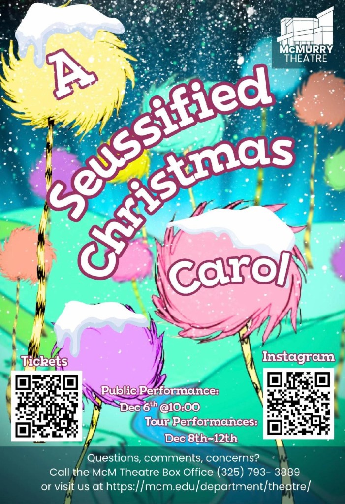 McMurry University Theatre presents “A Seussified Christmas Carol” for family audiences in collaboration with Young Audiences of Abilene at 2 p.m. Saturday, Dec. 6, in the Mabee Room of the McMurry Campus Center. Directed by Neena McLain. Free admission. “A whimsical reinvention of Dickens’ most beloved Christmas story in wacky rhymed couplets. With zoot fruited juices and binka bird geese.”