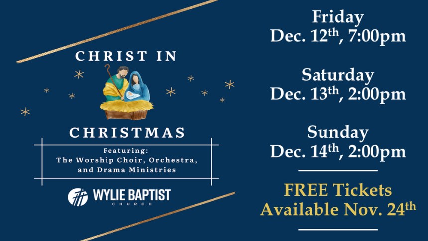 Wylie Baptist Church, 6097 Buffalo Gap Road, will present “Christ in Christmas” Dec. 12-14. Performances will be at 7 p.m. Friday, Dec. 12, and at 2 p.m. Saturday and Sunday, Dec. 13 and 14. The presentation features The Worship Choir and Orchestra and Drama Ministries. Free tickets are available at the church.